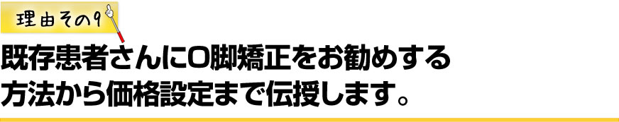 冒頭でも述べたように日本人の9割が潜在的にO脚の悩みを持っていることからもわかりますが、いかに自然に既存患者さんにご提案できるかが決め手です。