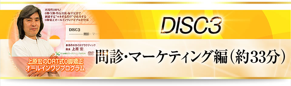DISC3では初診患者の問診、そして術後の問診、さらにO脚矯正マーケティングといった、今すぐ簡単に行動して結果を出す方法等、上原先生が日々結果を出し続けている全てを指導します。目的はあなたが今すぐこの0脚矯正で結果を出して売り上げを上げること。一緒に頑張りましょう!