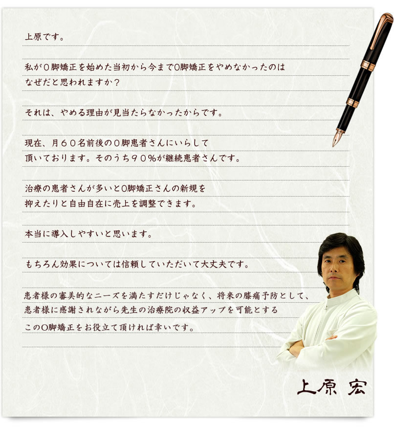 上原先生はそれを得るための0脚矯正技術と売上を上げるために