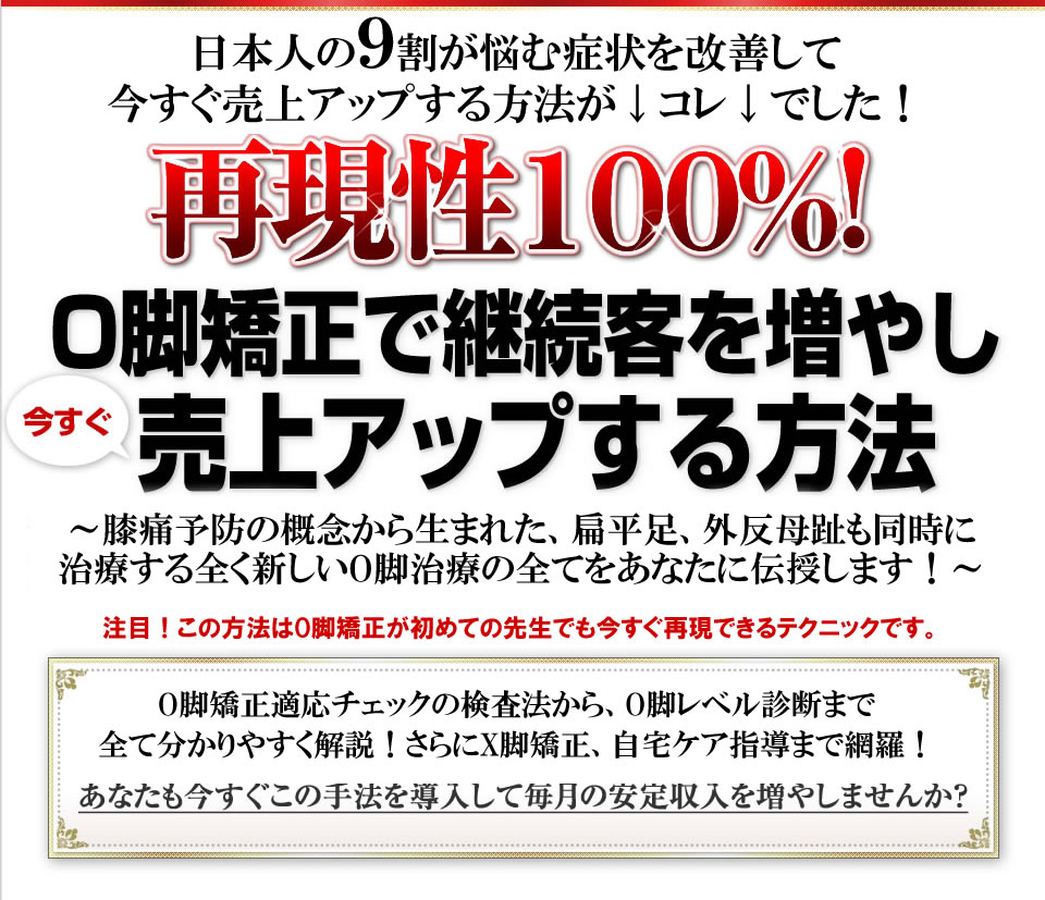 これからO脚矯正と取り入れる先生や、既にO脚矯正をやっているけど結果が出ていない先生のために、ご自身の持っている全てを包み隠さず公開してくださったものです。